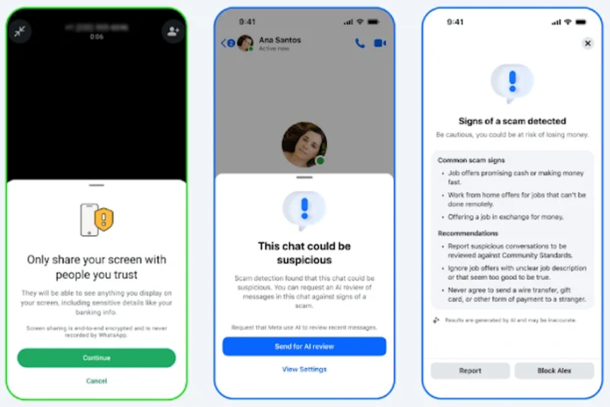 به گزارش کمیته رکن چهارم، در واتساپ، هنگام اشتراکگذاری صفحه با افراد ناشناس در تماس تصویری، هشدار امنیتی نمایش داده میشود تا از افشای اطلاعات حساس مانند کدهای بانکی جلوگیری شود. در مسنجر نیز گزینهای با عنوان «شناسایی کلاهبرداری» به تنظیمات اضافه شده که در صورت فعالسازی، پیامهای مشکوک از مخاطبین ناشناس را تشخیص داده و به کاربر هشدار میدهد.