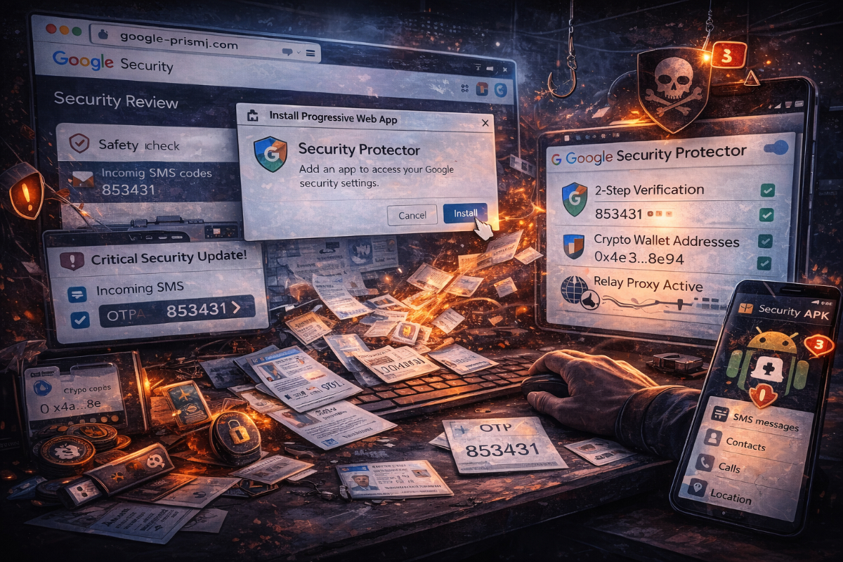 کمیته رکن چهارم – یک کارزار فیشینگ با جعل صفحه امنیت حساب گوگل، کاربران را به نصب یک اپلیکیشن وب پیشرونده (PWA) ترغیب میکند که قادر به سرقت گذرواژههای یکبارمصرف، جمعآوری نشانی کیفپولهای رمزارزی و تبدیل مرورگر قربانی به پراکسی مهاجم است.